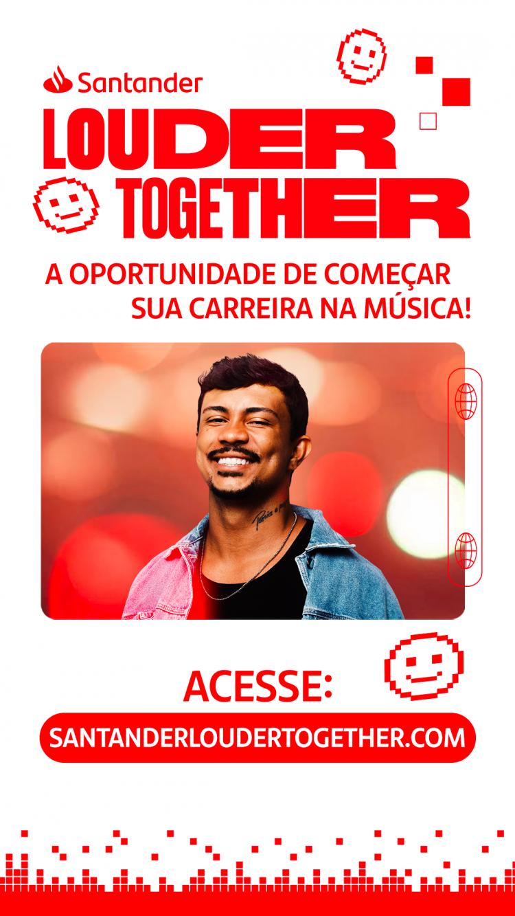 O Santander anuncia o projeto internacional Santander #LouderTogether, iniciativa que visa impulsionar a carreira de jovens talentos na área da música. O projeto oferece uma chance única para cantores e instrumentistas de todo o Brasil serem selecionados para gravar uma canção original e filmar um videoclipe em Barcelona, na Espanha, junto com outros países elegíveis. Para participar, os músicos deverão publicar um vídeo no TikTok até 8/8/2024 com sua música usando a hashtag #LouderTogether e marcar o perfil @Santander_Br na publicação.