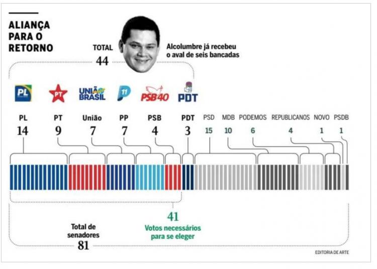A três meses da eleição, Alcolumbre angariou o apoio de seis bancadas que, somadas, representam a maioria no Senado, com 44 dos 81 senadores.
