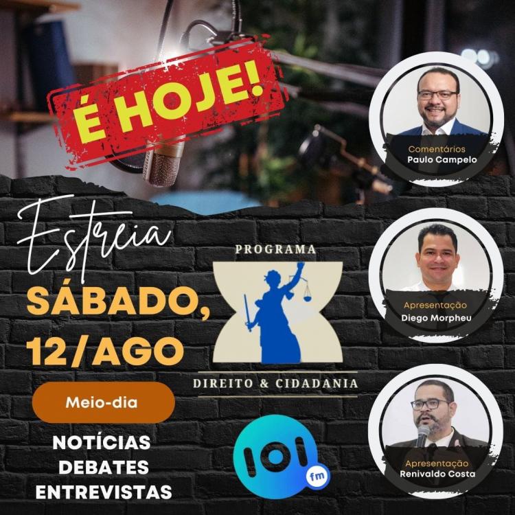 No dia 12, teve início um programa de rádio que promete enriquecer a programação da 101 FM com informação, debates e entrevistas de relevância. Sob o título de "Programa Direito & Cidadania", essa nova atração traz consigo uma equipe composta por renomados profissionais, dedicados a abordar questões fundamentais para a sociedade.