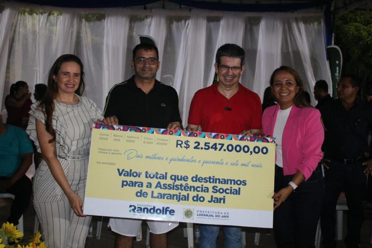 Durante a inauguração da praça, o senador entregou um cheque simbólico do investimento de mais de R$2,5 milhões para a Assistência Social do município em 2023.