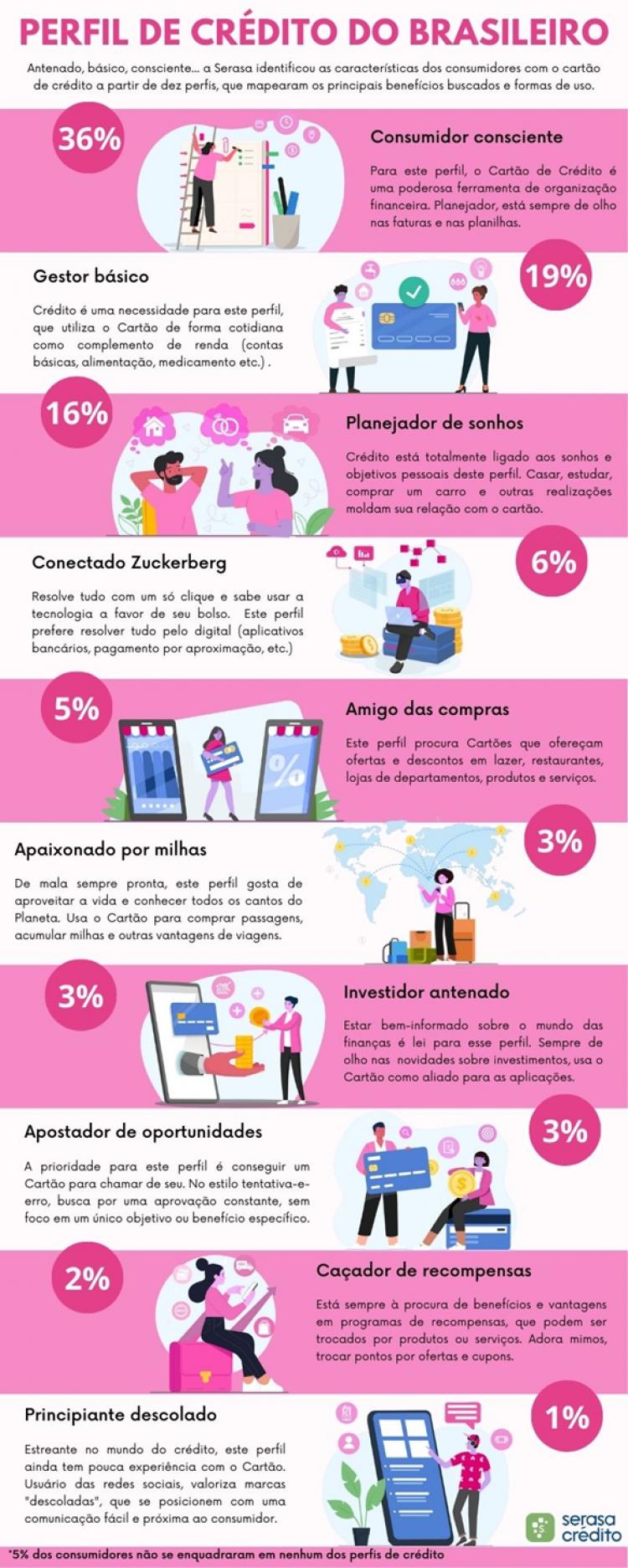 Com o objetivo de investigar a personalidade de uso entre os brasileiros, a Serasa definiu 10 Perfis de Crédito, que descrevem características, hábitos e desejos entre os usuários. De acordo com a pesquisa, a maior parte dos entrevistados (36%) se identificam como Consumidores Conscientes e entendem, portanto, que o cartão é uma ferramenta para a organização financeira. Ao mesmo tempo, 19% se consideram como Gestores Básicos, que utilizam o cartão de crédito de forma cotidiana para complementar a renda ao pagar contas básicas, como água, luz e gás.