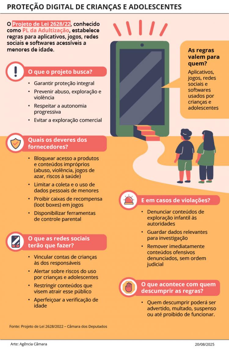 A Câmara dos Deputados começou a Ordem do Dia do Plenário e analisa agora o Projeto de Lei 2628/22, do Senado, que cria regras para a proteção de crianças e adolescentes quanto ao uso de aplicativos, jogos, redes sociais e outros programas de computador, estipulando obrigações para os fornecedores e garantindo controle de acesso por parte dos pais e responsáveis.