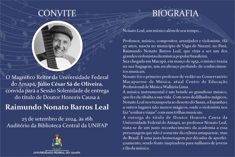 A Universidade Federal do Amapá (Unifap) entrega oficialmente na próxima quarta-feira, 25 de setembro, o título de Doutor Honoris Causa ao músico, compositor, arranjador e professor de cordas Raimundo Nonato Barros Leal, mais conhecido como Nonato Leal. A solenidade ocorre no auditório da Biblioteca Central, localizado no campus Marco Zero do Equador, em Macapá (AP), às 16h.