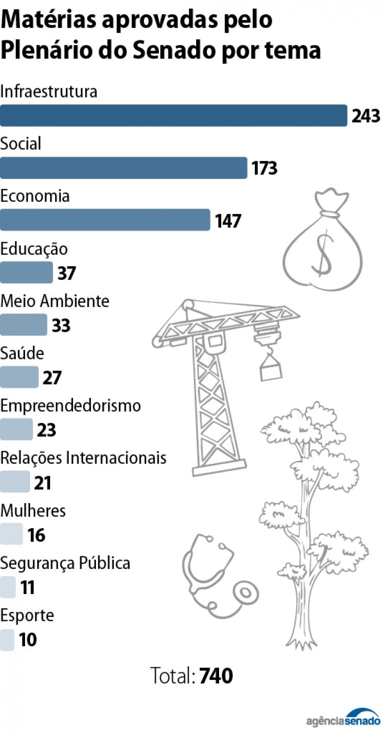 Entre os temas que passaram pelo crivo dos senadores e impactaram a sociedade em 2024 destacam-se a regulamentação da reforma tributária, a reforma do Novo Ensino Médio e as sanções do Pacote Antifeminicídio e da Política de Manejo Integrado do Fogo. Do total de proposições discutidas e aprovadas, 243 são relacionadas à infraestrutura; 173, à temática social; 147, à economia; 21 às relações internacionais; 11 à segurança pública e 10 a esportes.