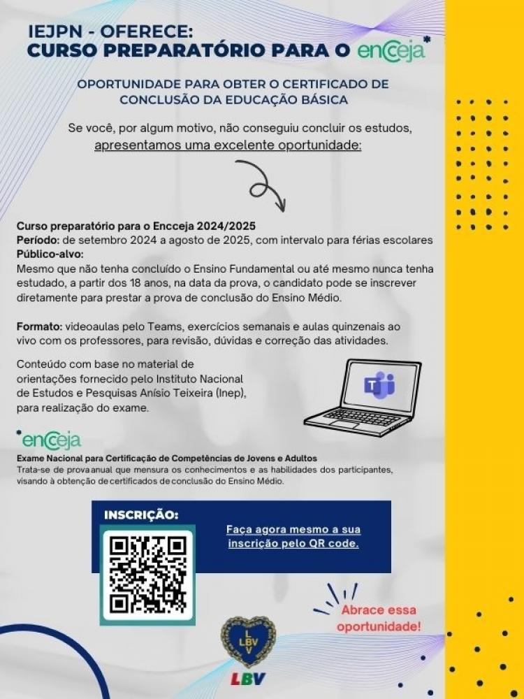O Instituto de Educação José de Paiva Netto (IEJPN), escola da Legião da Boa Vontade (LBV) na capital paulista, está oferecendo gratuitamente um Curso Preparatório (EAD) para candidatos que desejam obter a certificação do Ensino Médio no Exame Nacional para Certificação de Competências de Jovens e Adultos (ENCCEJA)-2025.