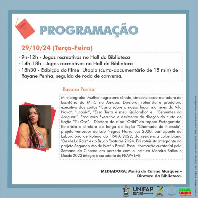 O evento inicia no Dia Nacional do Livro, 29 de outubro, com jogos recreativos no hall da Biblioteca Central ao longo do dia. Às 18h30, o público poderá assistir ao curta-metragem “Utopia”, dirigido por Rayane de Almeida Penha, seguido de uma roda de conversa mediada pela diretora da biblioteca.