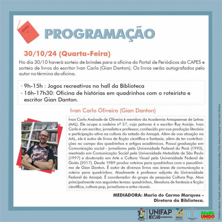 No dia 30 de outubro, os jogos recreativos continuam pela manhã e, à tarde, traz a Oficina de Histórias em Quadrinhos com o roteirista Gian Danton, às 16h. Às 18h, será realizada uma palestra sobre o uso do Portal da Capes e o Repositório da Unifap, apresentada pelas bibliotecárias Maria Cristina Quaresma Fernandes e Regina Célia Amaral da Conceição e pelo assistente administrativo Brendell Russo Araujo de Sousa. Os participantes aprenderão a acessar recursos essenciais para pesquisas acadêmicas e conhecerão o Repositório da Unifap, uma plataforma dedicada à preservação e disseminação da produção acadêmica da universidade.