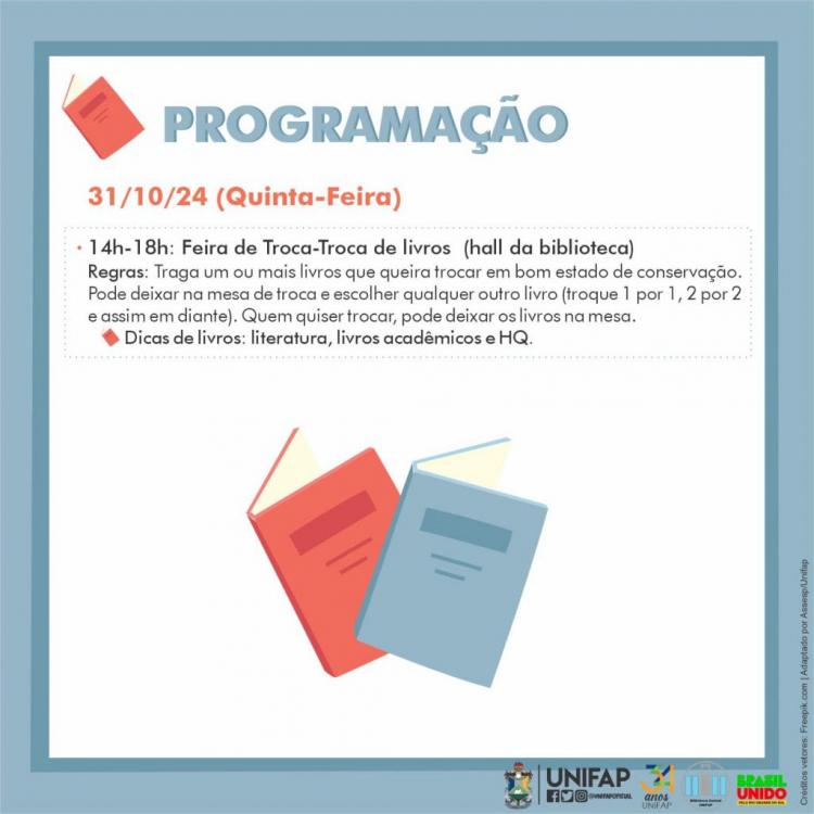 A Biblioteca Central, da Universidade Federal do Amapá (Unifap), festeja a Semana Nacional do Livro e da Biblioteca de 29 a 31 de outubro de 2024, em alusão ao Dia Nacional do Livro, comemorado em 29 de outubro. A data é celebrada em todo o Brasil e foi instituída pelo Decreto nº 84.631/1980.