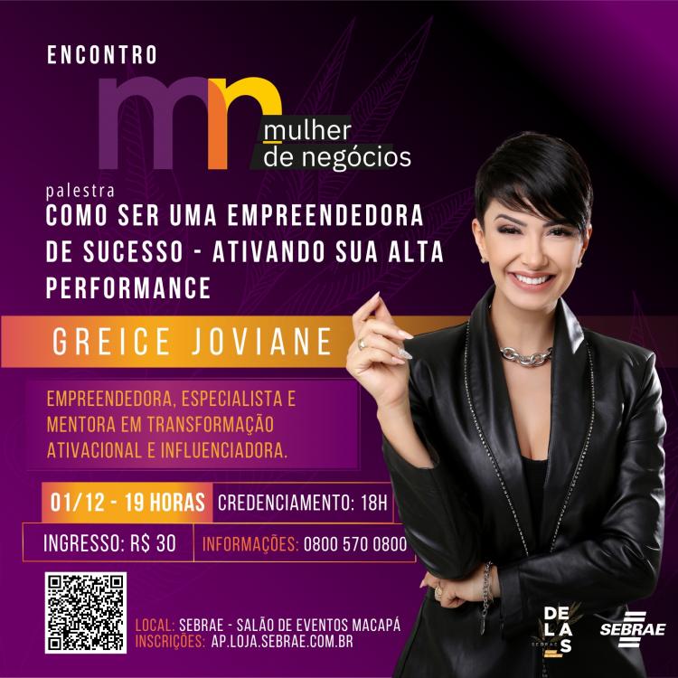 O Serviço de Apoio às Micro e Pequenas Empresas no Amapá (Sebrae), promove o Encontro Mulher de Negócios, com a participação de uma das maiores palestrantes femininas do Brasil, que revolucionou a área de cursos de treinamento e criou o método Sucesso Sem Stress (SSS), Greice Joviane. A programação fomenta o empreendedorismo e o protagonismo da mulher, fortalece os negócios e promove um momento de networking com outras empreendedoras. O encontro ocorre na sede do Sebrae no Amapá, no Salão de Eventos Macapá, às 19h.