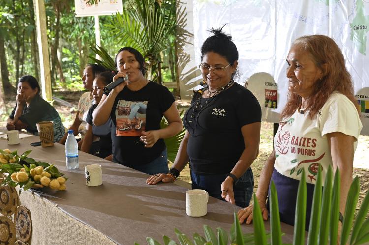 O trabalho com os SAFs, com os canteiros medicinais, o manejo do pirarucu, o artesanato e a organização social foram trazidos a partir do olhar das mulheres indígenas dos povos Apurinã e Paumari na primeira roda de conversa do intercâmbio.