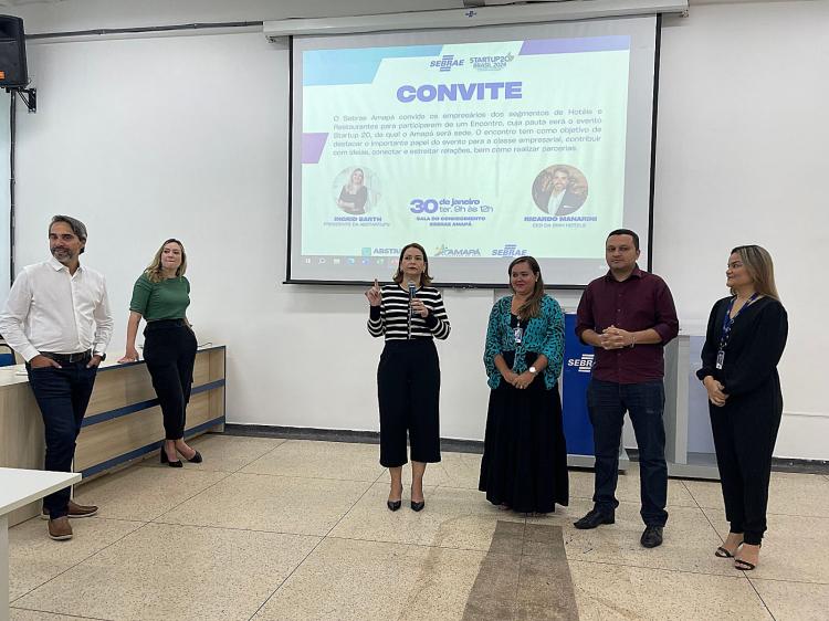 A diretora técnica do Sebrae, Suelem Amoras; o secretário de estado da Ciência e Tecnologia, Edivan Barros; a presidente da Associação Brasileira de Startups (ABStartup), Ingrid Barth; e o CEO da BWH Hotels, Ricardo Manarini; receberam na sede do Sebrae, nesta terça (30), às 9h, empresários de hotelaria e gastronomia. O objetivo é apoiar os setores econômicos que receberão visitantes nacionais e estrangeiros, no Encontro Startup20, que acontece na sede do Sebrae em Macapá, no período de 23 a 26 de fevereiro.