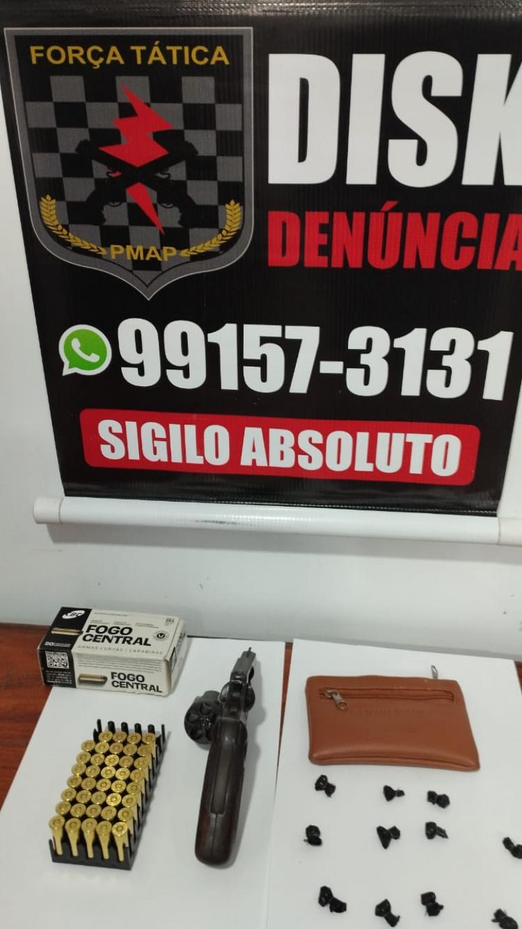 Através de denúncias, uma equipe do Batalhão de Força Tática conseguiu localizar o indivíduo. Foram apreendidos um revólver calibre .38 com a numeração raspada, munições e porções de substâncias supostamente entorpecente, do tipo crack.