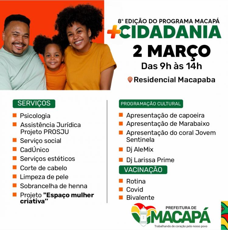Neste sábado (2) acontece a 8ª edição do programa Macapá + Cidadania, no Residencial Macapaba, Zona Norte da cidade, das 9h às 14h. Serviços de assistência jurídica, social, CadÚnico, corte de cabelo, limpeza de pele, entre outros, serão ofertados gratuitamente.