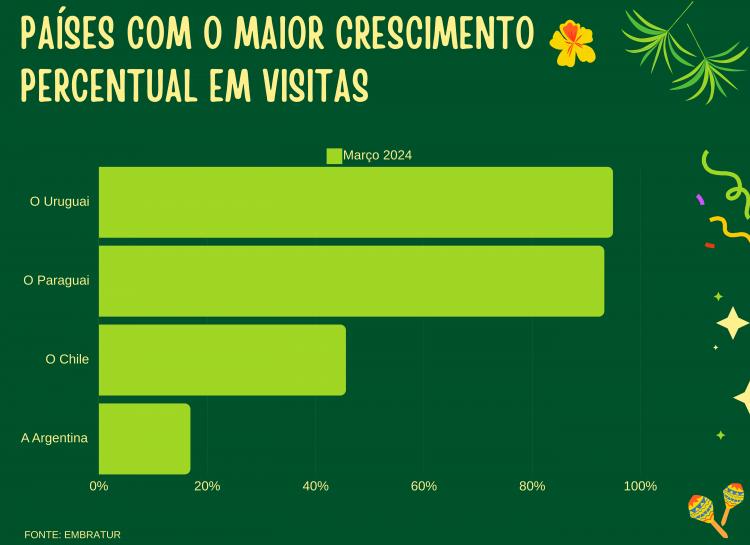 Por exemplo, o Uruguai registrou um aumento notável no número de turistas para o Brasil, quase dobrando as chegadas em relação a março de 2023. Com 70.866 chegadas, esse país apresentou um crescimento percentual de 94,9%, evidenciando a eficácia das estratégias de promoção turística adotadas.