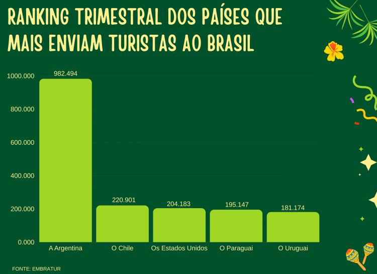 Na análise por países de origem dos turistas para o Brasil, o Chile é o líder com um crescimento de 51,8% em relação ao primeiro trimestre do ano anterior, com um total de 220.901 registros.