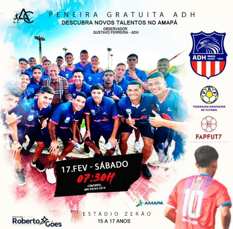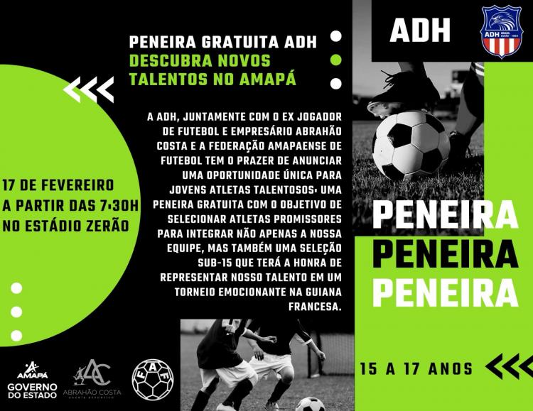 A Associação Desportiva Hidrolandense - ADH, juntamente com o ex Jogador de Futebol e empresário Abrahão Costa e e a FEDERAÇÃO AMAPAENSE DE FUTEBOL tem o prazer de anunciar uma oportunidade única para jovens atletas talentosos: uma peneira gratuita com o objetivo de selecionar atletas promissores para integrar não apenas a nossa equipe, mas também uma seleção sub-15 que terá a honra de representar nosso talento em um torneio emocionante na Guiana Francesa.