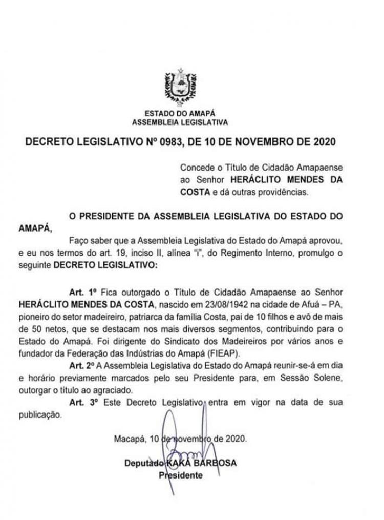 A Assembleia Legislativa do Amapá (Alap) entrega no dia 4 de março, em sessão solene, o título de Cidadão Amapaense post mortem ao pioneiro Heráclito Mendes da Costa. Ele faleceu em 19 de janeiro deste ano, aos 81 anos, vítima de complicações cardíacas.