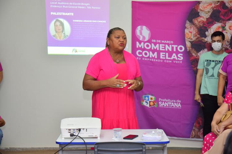 "Recebi o convite para estar aqui hoje, em um dos eventos da Prefeitura de Santana, em comemoração ao mês da mulher, para falar sobre autocuidado para as pessoas que trabalham nessa rede de atendimento às mulheres", afirmou.