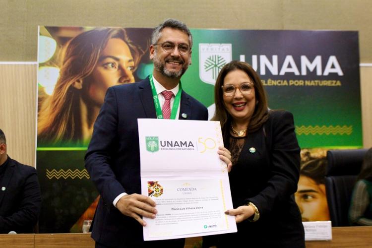 No encontro, que celebrou os 50 anos da Unama, o governador recebeu a primeira comenda da instituição. A medalha traz reconhecimento aos serviços prestados na educação, ciência, tecnologia, desenvolvimento socioeconômico e cultura.