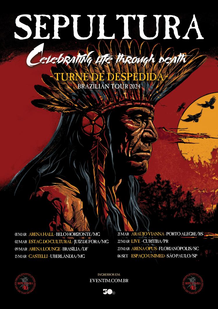 Após 40 anos de uma trajetória vitoriosa, em que levou o nome do Brasil mundo afora e passou pelos palcos mais importantes do mundo, o Sepultura vai parar as suas atividades. Antes, contudo, o grupo formado por Andreas Kisser, Derrick Green, Eloy Casagrande e Paulo Jr vai rodar o globo com uma turnê de despedida. No Brasil, a turnê intitulada "Celebrating life through death" terá realização da 30e. Neste primeiro momento serão oito datas no país. A venda de ingressos começa no próximo dia 11 de dezembro, às 12h, na Eventim. A tour também vai passar pela América Latina e Estados Unidos e novas datas serão anunciadas em breve.