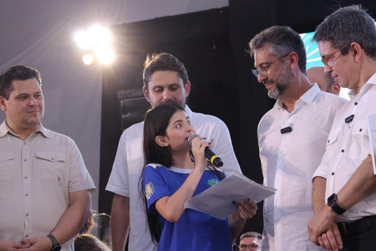 Comunicações para fortalecer a educação pública no Amapá, durante a Caravana Federativa do Governo Federal. Esses computadores serão distribuídos em mais de 30 escolas estaduais, com pelo menos 30 indo para a Escola Estadual de Tempo Integral Juvenal Guimarães Teixeira, em Calçoene. A estudante Lohana Chumber, de 15 anos, agradeceu a doação, destacando sua importância para a comunidade.