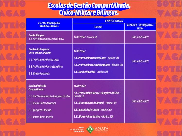 Nos dias 13 e 14 de janeiro, a Secretaria de Estado da Educação (Seed) vai realizar o sorteio de vagas para as escolas de gestão compartilhada, cívico-militar e bilíngue. O público-alvo são estudantes que ingressarão no 6º ano do fundamental e 1ª série do Ensino Médio, divididos nas oito escolas específicas da rede estadual, sendo cinco unidades em Macapá, duas em Santana e uma em Laranjal do Jari.