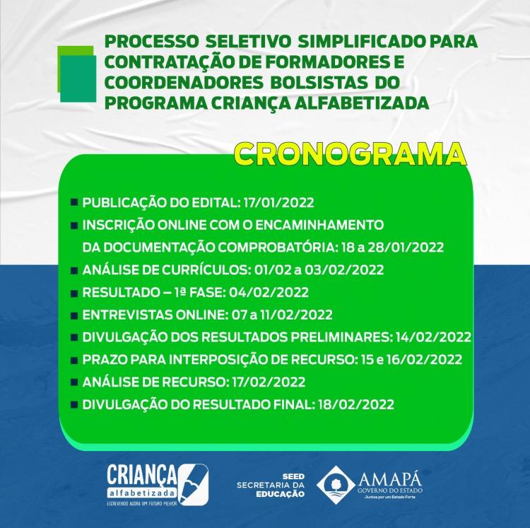 O Governo do Amapá lançou nesta segunda-feira, 17, o edital de seleção de professores formadores no Programa Criança Alfabetizada. As inscrições acontecem de 17 a 28 de janeiro, para educadores efetivos das redes municipal, estadual e federal de ensino.
