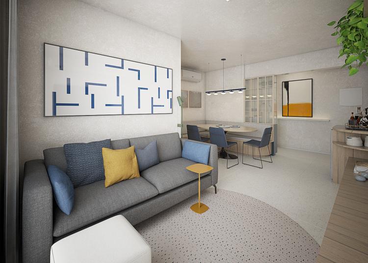 “Esse é um projeto muito procurado e com características neutras – porém nada clichês -, do projeto são desejadas por muitos de nós: madeira, iluminação indireta com led, amplitude e integração dos espaços, um closet maravilhoso, um porcelanato com a referência do granilite e um espaço generoso para receber os amigos. Sem falar no tom azul da cozinha que é elegante e atemporal”, afirma Rafaela Giudice.