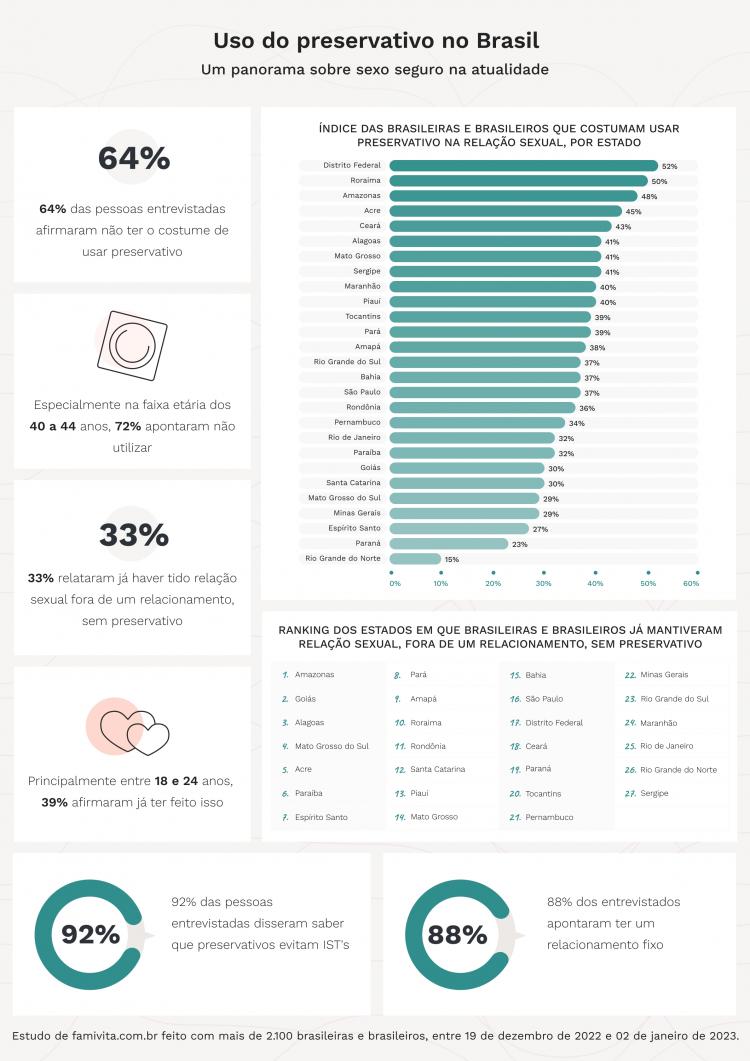 A observação dos dados por estado mostrou que no Amazonas 46% dos integrantes da pesquisa mantiveram relações sexuais sem preservativo, mesmo estando fora de um relacionamento. No Espírito Santo, esse número foi de 39% e em São Paulo de 34%. Sobre isso, Pernambuco e Tocantins empataram com 30%. Por outro lado, em Sergipe, 13% afirmaram terem feito isso.