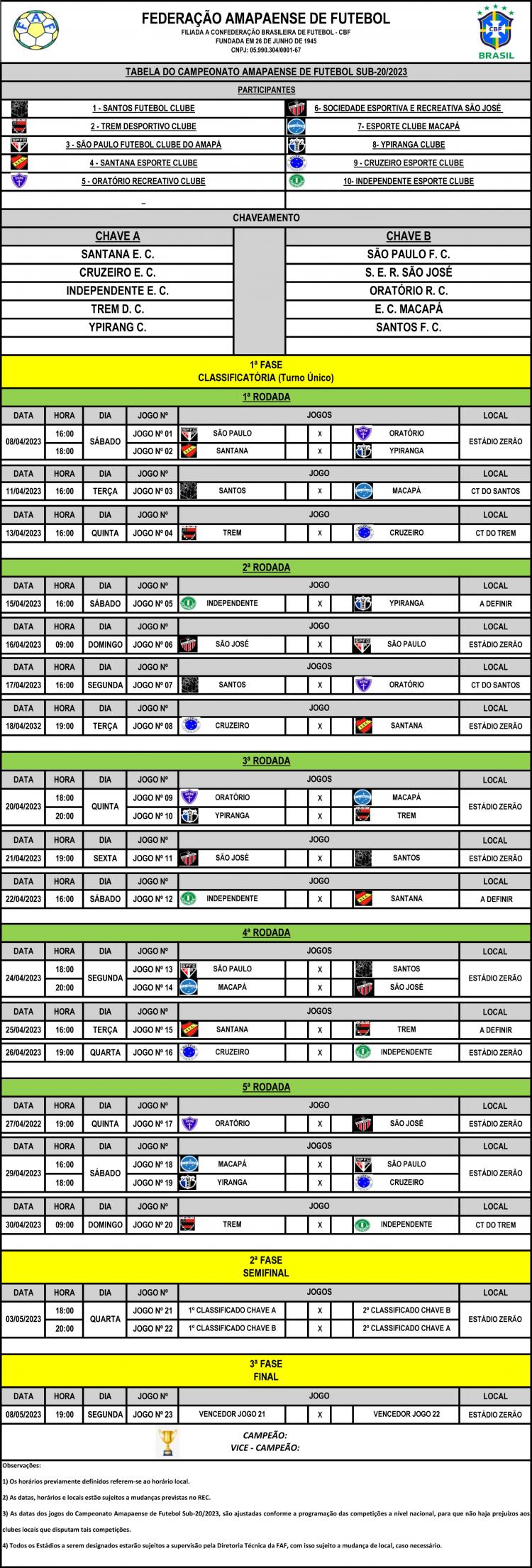 A Federação Amapaense de Futebol (FAF) anunciou a tabela de jogos do Campeonato Sub-20 deste ano, que conta com a participação de dez clubes profissionais e não profissionais. A competição começará com uma partida no Estádio Zerão no Sábado de Aleluia, dia 8 de abril. As partidas acontecerão também nos centros de treinamentos do Trem e do Santos/AP, e os clubes foram divididos em duas chaves.