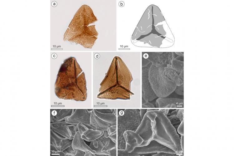 4) Diferentes vistas do material estudado (veja a legenda no texto para mais contexto) - Crédito - Salvi et al. (2025). (a, c–d) Vista superior (proximal) de esporos encontrados no local, com forma geral levemente triangular, observados ao microscópio óptico. (b) Desenho reconstruindo, de forma aproximada, como é o esporo visto de cima. (e) Imagem obtida em microscópio eletrônico mostrando a face inferior (distal) de um esporo, com superfície predominantemente coberta por pequenas saliências arredondadas. (f) Visão geral de vários esporos observados juntos no microscópio eletrônico. (g) Imagem aproximada da face superior de um esporo, destacando linhas, margens e áreas entre as saliências. Ao fundo, um segundo esporo mostra a face inferior, com saliências alongadas que às vezes se conectam entre si, formando um padrão rugoso.
