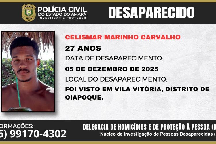 A Polícia Civil do Estado do Amapá pede a colaboração da população com informações que levem ao paradeiro de Celismar Marinho Carvalho, de 27 ...