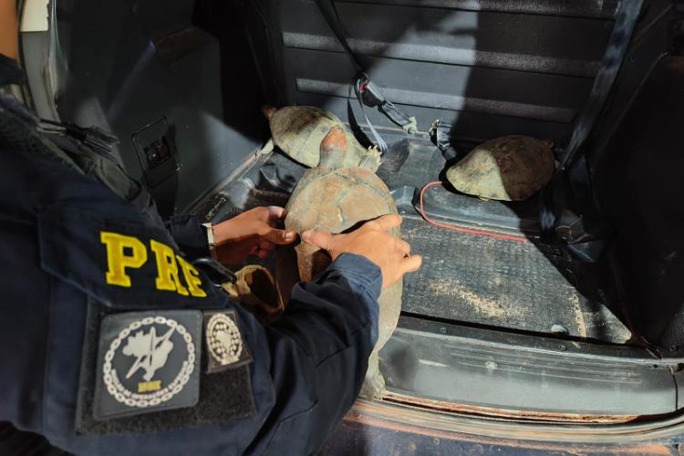 Durante comando de fiscalização veicular, a Polícia Rodoviária Federal no Amapá encontrou três quelônios da espécie tracajá, ainda com vida, ...