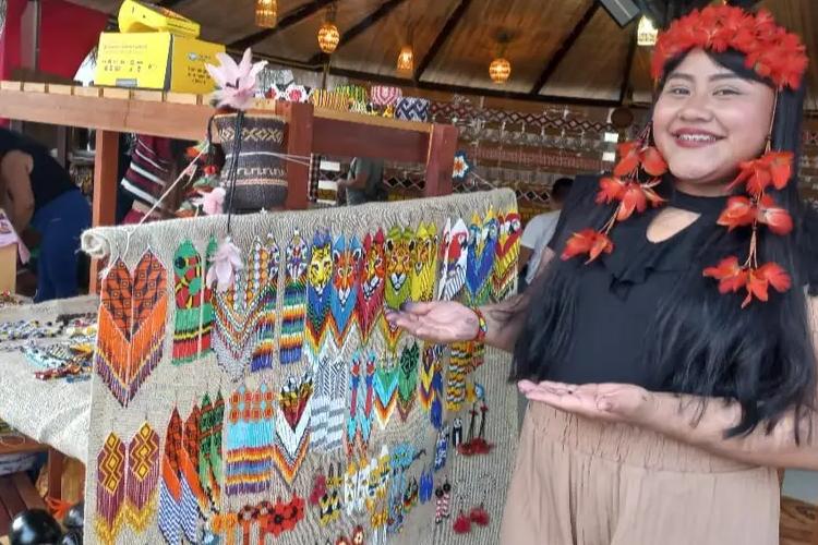 Dos cocares aos colares e brincos de animais coloridos, Juliana Santos, de 20 anos, da etnia Galibi-Maworno, fatura nas vendas na 54ª Expofeira d...