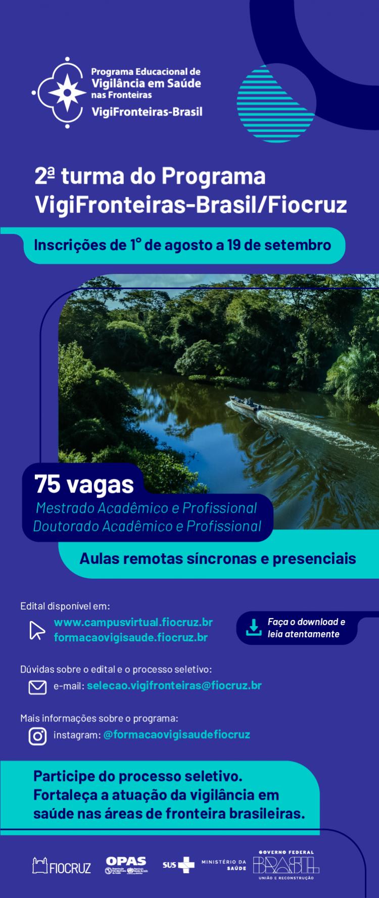 A Fundação Oswaldo Cruz (Fiocruz) está com inscrições abertas para o processo seletivo da segunda turma do Programa Educacional em Vigilância em Saúde nas Fronteiras, o Programa VigiFronteiras-Brasil, iniciativa da instituição em parceria com a Secretaria de Vigilância em Saúde e Ambiente do Ministério das Saúde (SVSA/MS) e a Organização Pan-Americana da Saúde (Opas). Profissionais brasileiros e estrangeiros que trabalham na gestão, na assistência e na avaliação da qualidade dos serviços de vigilância em saúde de todo o país, em especial em doenças transmissíveis, nas fronteiras dos estados do Brasil com a América do Sul, podem participar. O objetivo é formar mestres e doutores para contribuir com o fortalecimento das ações e serviços de vigilância em saúde nas regiões da faixa de fronteira do Brasil e nos países vizinhos (Argentina, Bolívia, Colômbia, Guiana, Paraguai, Peru, Suriname, Uruguai e Venezuela, e uma Região Ultramarina da França, a Guiana Francesa). Os editais estão disponíveis para download no www.campusvirtual.fiocruz.br e no site https://formacaovigisaude.fiocruz.br/ . As inscrições são gratuitas poderão ser feitas até 19 de setembro no Acesso Fiocruz (https://acesso.fiocruz.br ).