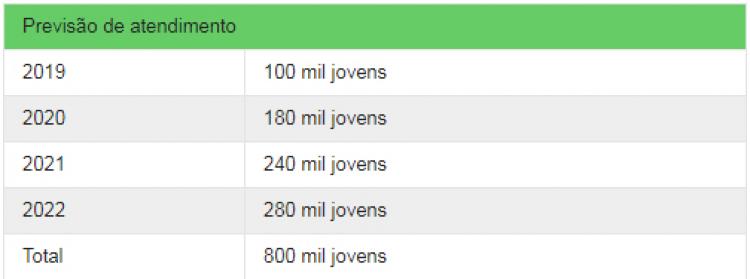 Segundo o acordo, os 800 mil jovens serão atendidos com reforço de português e matemática em módulos de 100 horas, com o desenvolvimento de habilidades socioemocionais integradas a cursos de qualificação profissional de 200 horas, em média. O programa ajudará a promover a empregabilidade e a geração de renda desta parcela da população em situação de vulnerabilidade. Segundo o acordo, serão contemplados os jovens inscritos no Cadastro Único de Programas Sociais do governo federal, com prioridade para os beneficiários do Bolsa Família.