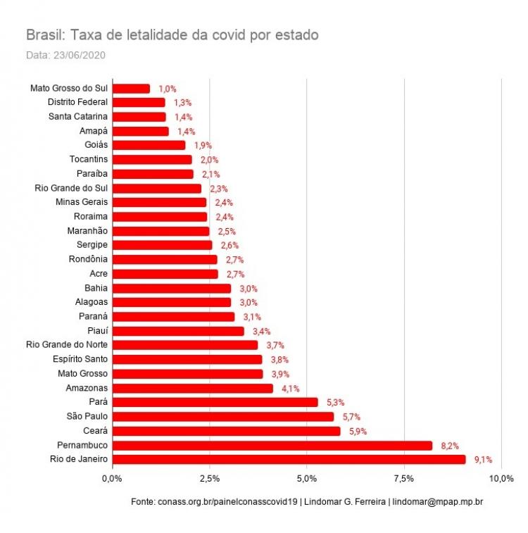 A letalidade no Amapá também está bem abaixo da média nacional, que atualmente é 4,6%, ficando atrás apenas de Mato Grosso do Sul, Distrito Federal e Santa Catarina. Já na região norte, a taxa amapaense é a menor, sendo o estado do Pará a maior com 5,27%. Confira o gráfico por estados do país.