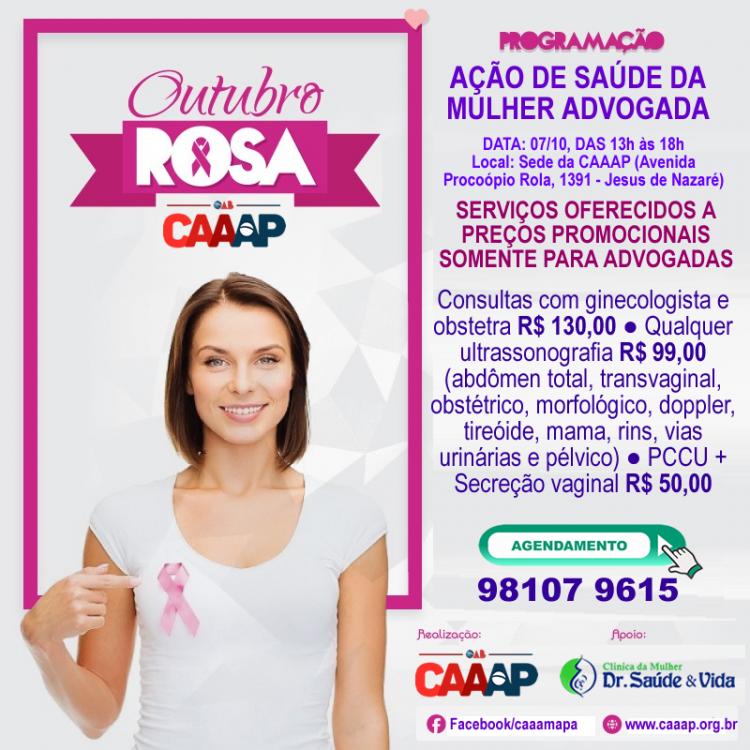 A Caixa de Assistência dos Advogados do Amapá (CAAAP), em parceria com a Clínica da Mulher Dr. Saúde e Vida promovem no próximo dia 7 de outubro, das 13h às 18h, uma ação de saúde como parte do Outubro Rosa, campanha de conscientização que tem como objetivo principal alertar as mulheres e a sociedade sobre a importância da prevenção e do diagnóstico precoce do câncer de mama e mais recentemente sobre o câncer de colo do útero.