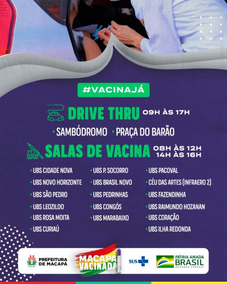 No dia 13 de fevereiro, Dia D da Campanha para Idosos, as ações de vacinação serão realizadas simultaneamente em dois postos de drive-thru (Sambódromo e Praça do Barão) e em 17 Unidades Básicas de Saúde (UBSs) – UBS Cidade Nova, UBS Perpétuo Socorro, UBS Pacoval, UBS Novo Horizonte, UBS Brasil Novo, CEU das Artes zona norte, UBS São Pedro, UBS Fazendinha, UBS Pedrinhas, UBS Leozildo, UBS Congós, UBS Raimundo Hozanan, UBS Rosa Moita, UBS Marabaixo, UBS Coração, UBS Curiaú e UBS Ilha Redonda.