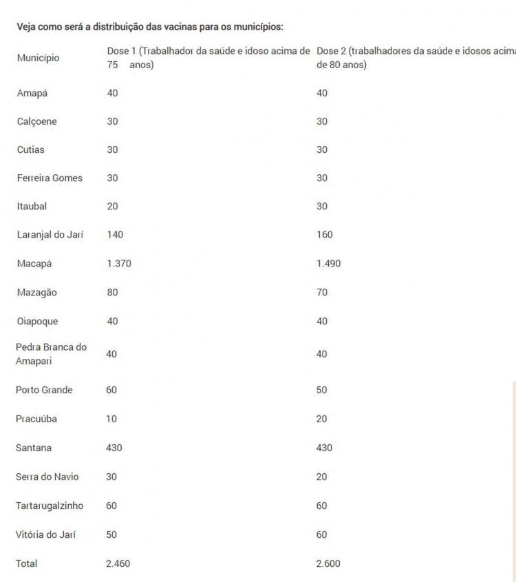 Além disso, serão distribuídas também 2.600 doses pertencentes ao lote anterior, referentes à segunda dose para idosos acima de 80 anos e trabalhadores da saúde.