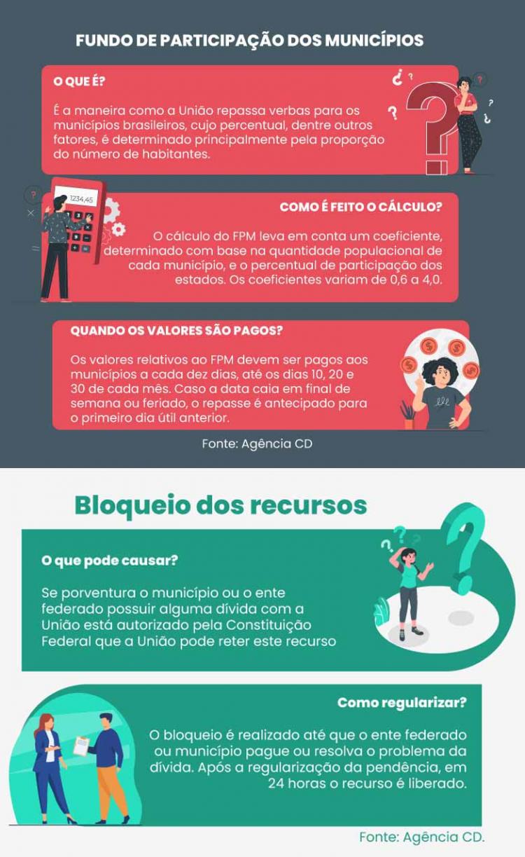 Cerca de 54 municípios se encontram bloqueados e não poderão ter acesso à parcela do fundo. O bloqueio acontece se, porventura, o município ou o ente federado possuir alguma dívida com a União. Neste caso, é autorizado pela Constituição Federal que a União pode reter este recurso. Segundo o economista especialista em Orçamentos Públicos, Cesar Lima, o maior motivo de bloqueio em relação ao FPM é causado pelo INSS. “O que as prefeituras devem fazer é procurar a Procuradoria Geral da Fazenda Nacional, a procuradoria do INSS mais próxima, para tentar ajustar a sua situação frente ao fisco e desbloquear essas parcelas do FPM”, explicou.