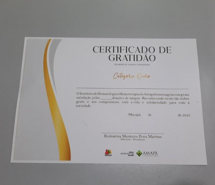 Para demonstrar gratidão por esse ato, que ajuda a salvar muitas vidas, o Hemoap decidiu certificar os doadores considerados regulares na instituição. A certificação começará no dia 2 de junho e seguirá até o final do mês. Os certificados são divididos em: verde, bronze, prata, ouro, diamante e pós diamante, e eles representam uma ordem crescente no quantitativo de doações.
