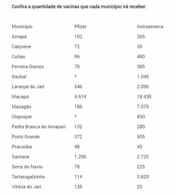 De acordo com a SVS, o município de Macapá recebeu um ajuste de 1.000 doses da vacina Astrazeneca destinadas a trabalhadores da saúde. O ajuste foi acordado com o município para atender profissionais do sistema de saúde de entidades particulares.