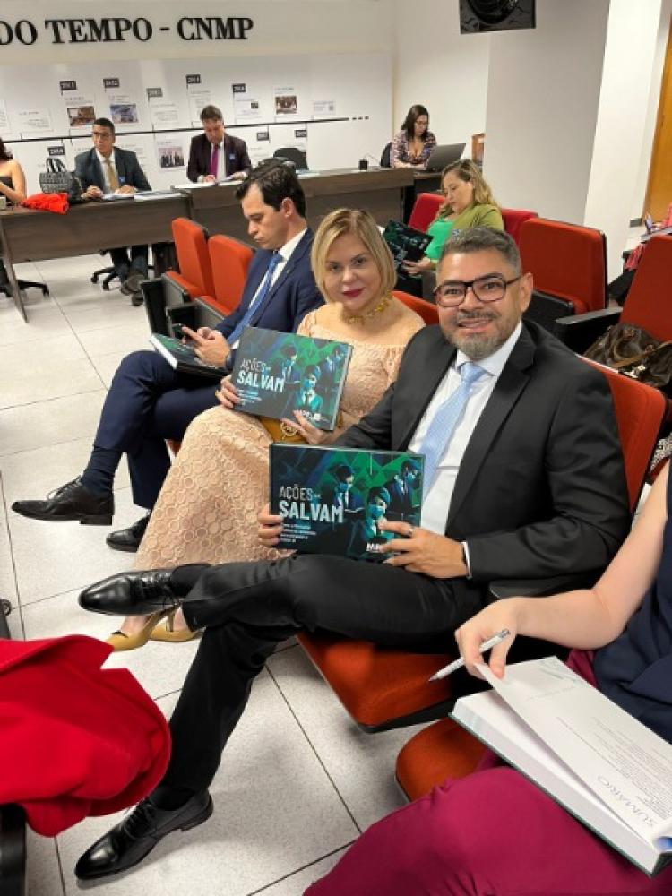 O procurador-geral de justiça Ministério Público do Amapá, Paulo Celso Ramos, e a procuradora de justiça e conselhereira eleita do CNMP, Ivana Cei, estiveram no lançamento da publicação "Ações que salvam: como o Ministério Público se reinventou para enfrentar a Covid-19". Apresentado nesta terça-feira (22) em sessão plenária do Conselho Nacional do Ministério Público (CNMP), em Brasília, o livro apresenta números e resultados obtidos nas esferas judicial e extrajudicial. "A pandemia foi um momento desafiador para todos. Não foi diferente com os órgãos ministeriais. Tivemos que nos adaptar a realidade do trabalho remoto, sem deixarmos de atuar em nenhum momento e todos os membros, em uma corrente nacional, cobramos e conquistamos medidas efetivas no enfrentamento à Covid-19. Por isso essa obra é valoroza para os anais da literatura dos ministérios públicos brasileiros", ressaltou o procurador-geral, Paulo Celso. Durante a solenidade de lançamento, o procurador-geral da República, Augusto Aras, mencionou o valor histórico e humano da publicação. "Esta publicação é um testemunho do esforço coletivo, do espírito de solidariedade e da capacidade de superação de colegas procuradores e promotores. A proporção da pandemia nos exigiu muito diálogo e objetividade para evitar delongas judiciais em cenário de excepcional crise", disse.