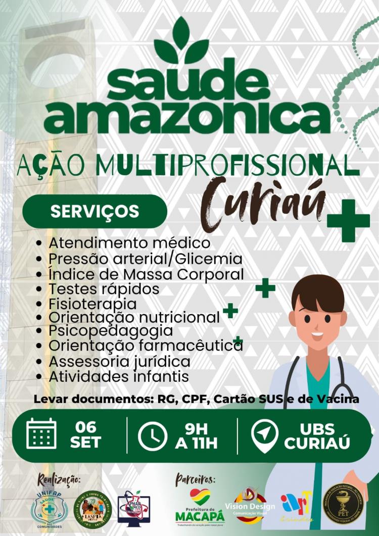 Serviço Ação multiprofissional “Saúde Amazônica” Dia 6 de setembro de 2025, às 9h, na UBS Hilda Iléia Sant’anna Ramos (UBS Curiaú) – Rod. AP-070, nº 506, Curiaú, Macapá (AP) Entrada gratuita.