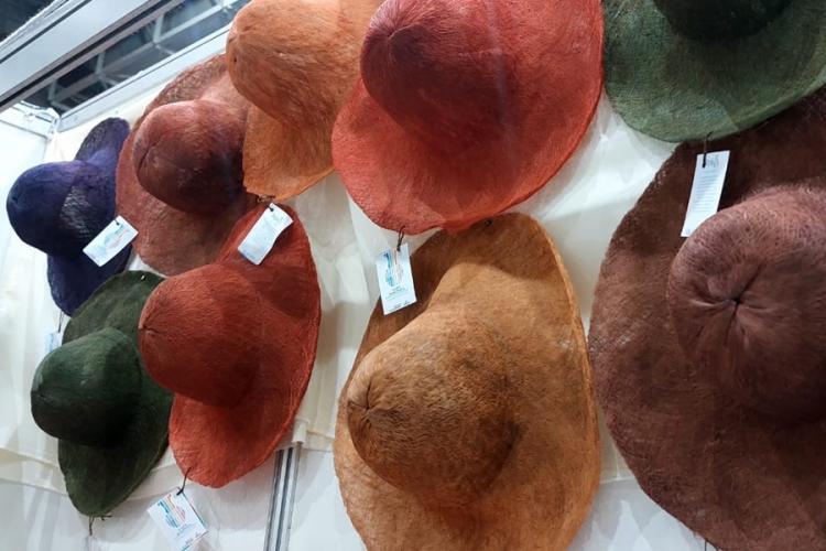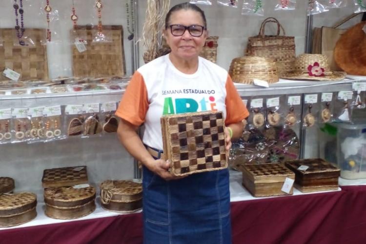 Rizonete Morais, de 54 anos, que veio de Ferreira Gomes, participa pela primeira vez do evento trazendo peças de fibra de banana, transformando-as em chapéus e bolsas. O material usado é da sua própria plantação para utilizar na fabricação.