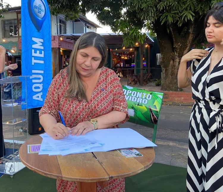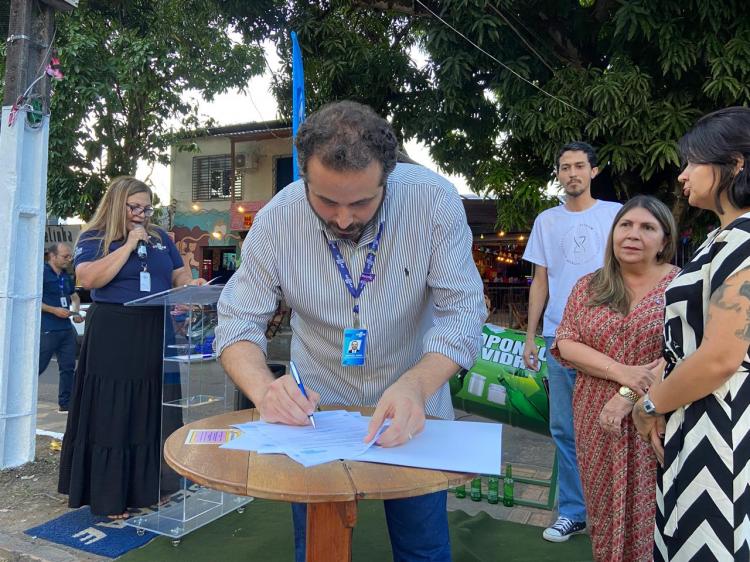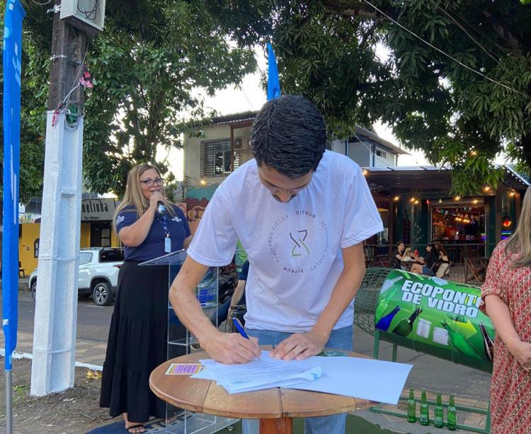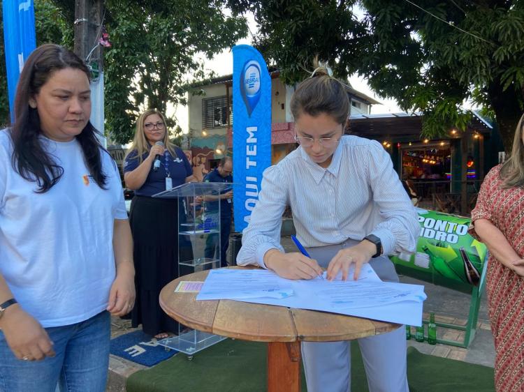 Durante a entrega dos Ecopontos no corredor de bares e restaurantes, na Avenida Mendonça Furtado, entre as ruas Eliezer Levy e Odilardo Silva, assinaram o Termo de Compromisso para coleta dos resíduos de vidro recicláveis e descartados nos Ecopontos, a superintendente do Sebrae, Alcilene Cavalcante; o diretor de administração e finanças do Sebrae, Marcell Harb; a empresária do Bar do Villa, Aline Araújo; pela Empresa Vitrum Reciclagem Ltda., Júlio Silvestre; como testemunhas a gerente da UAF/Sebrae, Maria Inês Barbosa; e a empresária Manu Coutinho.