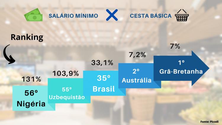 De acordo com o ranking desenvolvido ainda em 2021 pela plataforma de e-commerce Picodi que faz a relação de porcentagem entre o valor da cesta básica e o salário mínimo, o Brasil ocupava a 35ª posição dentre os 56 países estudados.