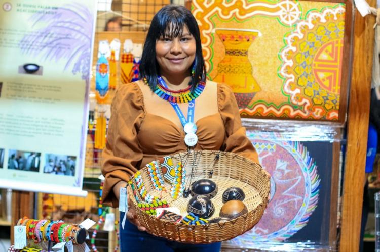 A artesã Tairine Karipuna levou à feira de negócios a rica diversidade cultural dos povos indígenas do Amapá, por meio de peças que expressam a ancestralidade e o talento de cerca de 200 artesãos de sua região. Integrante do povo Karipuna, Tairine atua como gerente da loja Empório Uasei, localizada no município de Oiapoque, no extremo norte do estado.