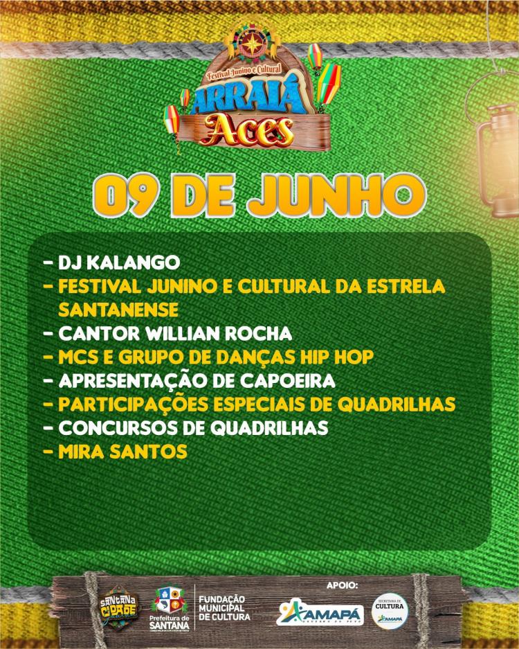 No dia 09/06, à noite, o evento começa com a melhor seleção musical do DJ Kalango, seguido das apresentações do Festival Junino e Cultural da Estrela Santanense. Em seguida, o cantor Willian Rocha subirá ao palco. Depois, entram em cena, atrações de hip-hop, capoeira, participações especiais de quadrilhas e o tão esperado concurso de quadrilhas. Para finalizar o primeiro dia, a cantora Mira Santos se apresentará.